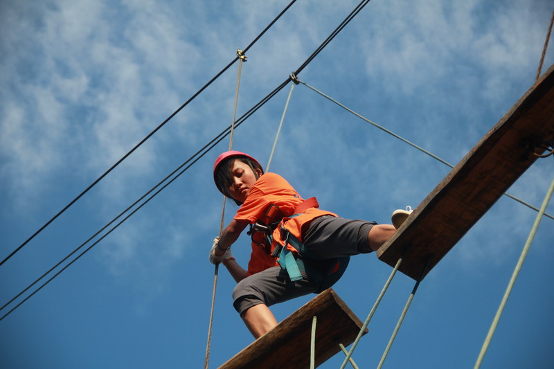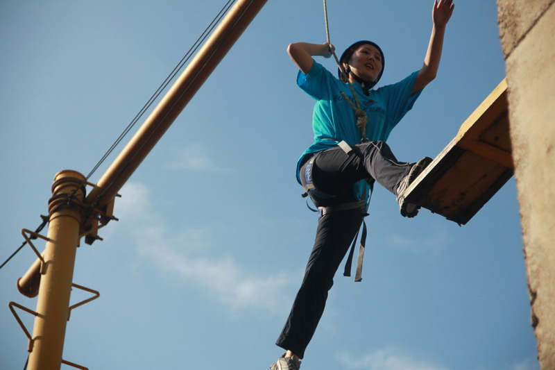高空项目——空中断桥是一个离地8米多的一段桥。学员需要从断桥的一端跳到另一端,然后返回。简单的一个动作下面凝聚着一连串复杂的心情。纵身一跃的那一刻,心中已是翻腾着太多太多……许多顺利完成项目的学员表示高空项目表面看起来是很难,其实并没有想像中那么可怕。教练告诉我们:“在困难、危险面前,你越犹豫,就会越畏惧,但如果你战胜心理障碍,勇敢的一搏,你就为自己赢得了成功的机会。”心理的障碍是最难逾越的,我们如果要成为强者,首先就必须挑战自己的恐惧感,当我们豁出去一搏,勇敢的跨出一小步,也许就能抓住属于自己的机会,实现人生一大步的跨越。